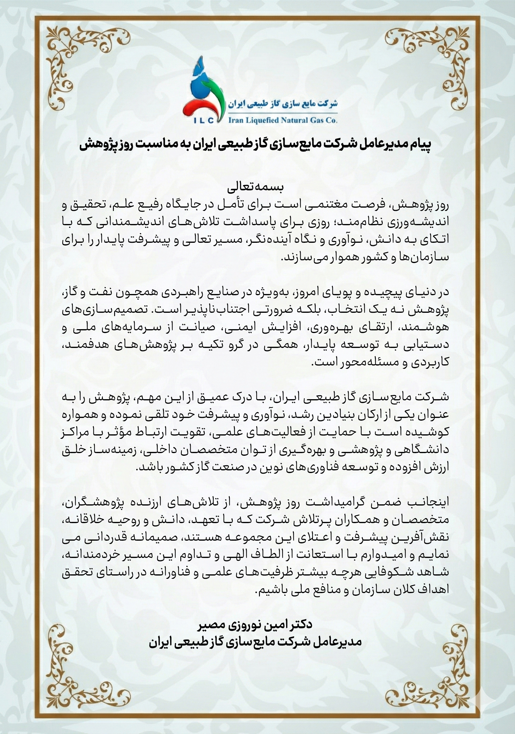 اینجانب ضمن گرامیداشت روز پژوهش، از تلاشهای ارزنده پژوهشگران، متخصصان و همکاران پرتلاش شرکت که با تعهد، دانش و روحیه خلاقانه، نقشآفرین پیشرفت و اعتلای این مجموعه هستند، صمیمانه قدردانی مینمایم و امیدوارم با استعانت از الطاف الهی و تداوم این مسیر خردمندانه، شاهد شکوفایی هرچه بیشتر ظرفیتهای علمی و فناورانه در راستای تحقق اهداف کلان سازمان و منافع ملی باشیم.
